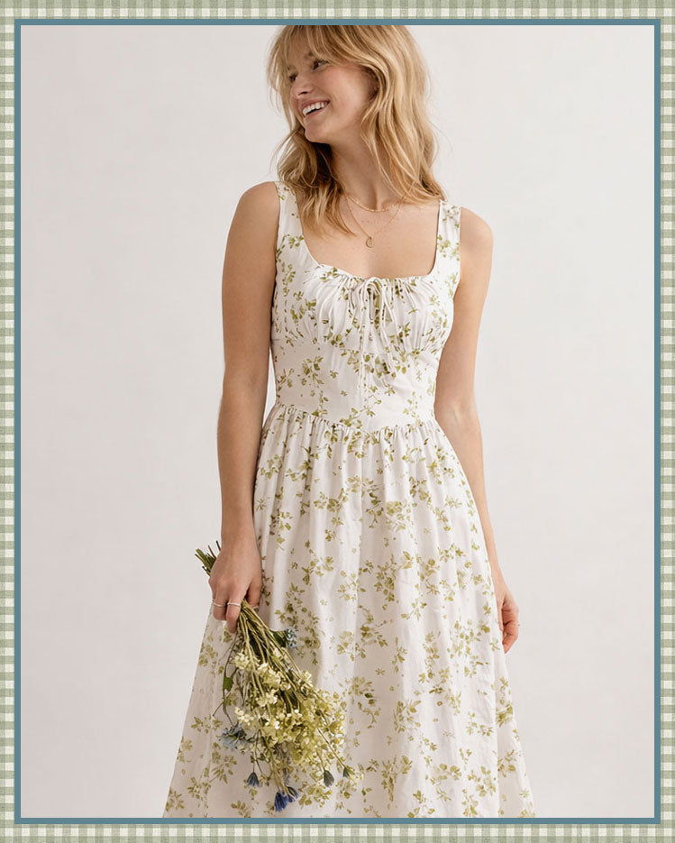 Romantic and feminine vintage inspired midi dress in light chambray blue featuring sweet ditsy floral embroidery throughout in white thread. This midi length dress features short puffed cap sleeves, a smocked bodice, and soft a-line skirt. 100% Cotton Imported Fit...
